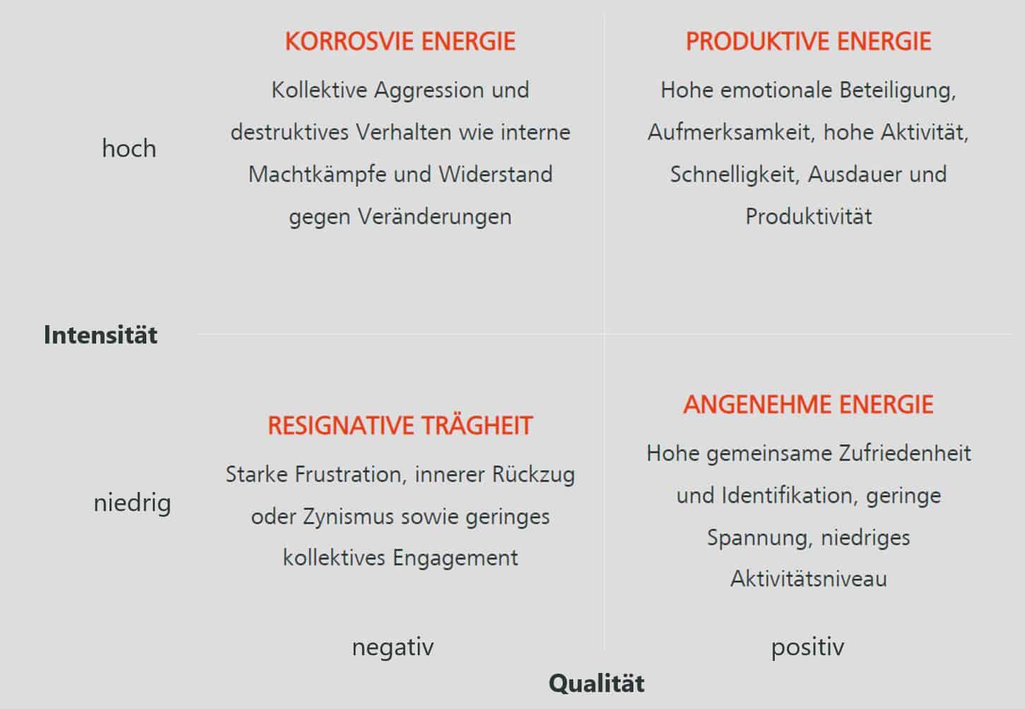 Bei der Energiemessung wird ein validierter Fragebogen verwendet. Es wird ein Energieindex ausgegeben sowie die dahinterliegende Dynamik auf der Energiematrix ausgegeben: